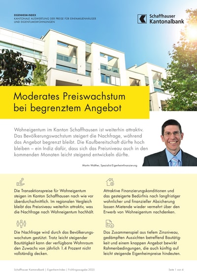 Sie wollen mehr über die aktuelle Preisentwicklung von Wohneigentum im Kanton erfahren? Der Eigenheim-Index der Schaffhauser Kantonalbank informiert zweimal jährlich über die Preise von Eigentumswohnungen und Einfamilienhäusern in unserer Region. Die Publikation stellt die Zahlen in Relation zur gesamtschweizerischen Entwicklung, analysiert Veränderungen und gibt Auskunft über die Situation in den einzelnen Gemeinden. Grundlage des Index bilden die von der IAZI AG bereitgestellten Daten und Erkenntnisse.