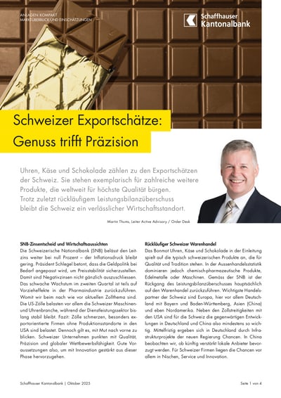 «Anlagen kompakt» – so heisst unsere Anlagepublikation. Kompakt, weil unsere Anlagespezialistinnen und -spezialisten Ihnen auf einfache, kurze und doch fundierte Art unsere Einschätzung zu den Finanzmärkten und zur Anlagepolitik darlegen.